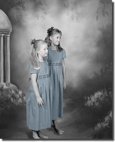 ![]() My Comments... "Young girls are lovely in their bare feet and gowns, and offer a wide range of creative portrait options. For this portrait, I added a slight fantasy look to the portrait. I created this portrait in the studio using one of my scenic backgrounds. I really love the way the tones of this background blend together to add depth to the portrait. I used Adobe Photoshop to transform the image to black and white while using hand coloring to bring back some color and focus to the girls."