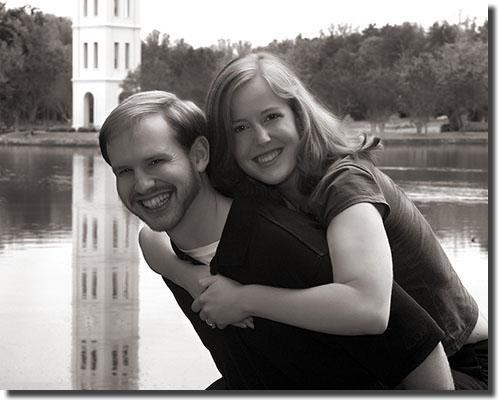 ![]() My Comments... "During their engagement portrait session, we created images at many different places around their college campus - places that were special to the couple. The great thing about doing an engagement portrait session such as this is that we spent a lot of time together during the day. I had never met Jeremy, so this gave us a chance to get to know each other casually prior to the wedding. We had a great time. Sometimes I asked them to do specific things and other times I just allowed them to interact with each other. I was switching out my memory card when I turned around and saw them playing with her on his back. With a couple of minor positioning adjustments to get the bell tower in the background, we created a great image. They used this image for their wedding programs."