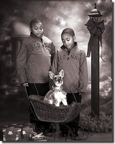 ![]() My Comments... "For this image, I wanted to create a nighttime outdoor Christmas scene in the studio. During the session, we had already created a number of other images of the family and I wanted to provide the client with some extra variety. I selected this studio background because I really like the depth it provides in black and white. I added the street light, sleigh, and presents to the scene. I placed the dog into the sleigh, and let the boys interact with the dog. Both the dog and boys did very well."